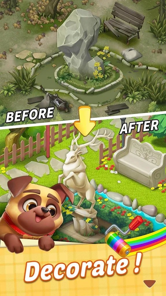 游戏设定中,玩家继承了一座亟待翻新的老旧庄园,需通过完成消除关卡收集装修材料。每个关卡对应不同区域改造任务,包括客厅、厨房、花园及狗窝等场景。剧情主线围绕主角简的室内设计师成长之路展开,穿插与邻居的甜蜜互动及小镇居民的故事支线。操作采用经典三消机制,通过匹配元素解锁家具与装饰品,逐步实现从基础修复到奢华定制的全流程改造。