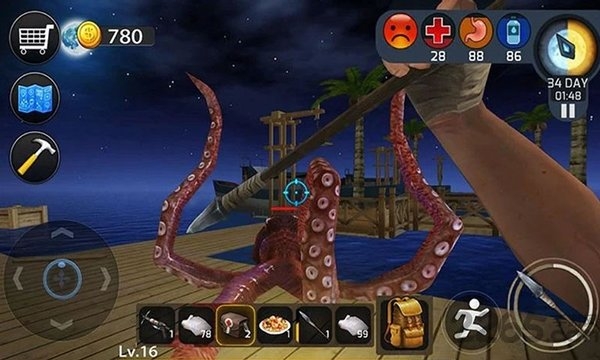 游戏开场时角色会身处4x4规格的简陋木筏,手持塑料钩作为唯一工具。海洋中漂浮的木板、塑料桶、棕榈叶等物资需要通过精准投掷钩爪获取,这些材料可用于制作蒸馏器解决饮水问题,建造炉具烹饪食物,制造矛具对抗虎视眈眈的鲨鱼。木筏规模扩大,还能搭建农作物土地种植土豆甜菜,制作天线接收器解锁剧情导航。特别值得注意的是动态生态系统,昼夜交替与随机天气会影响海洋能见度与资源刷新频率,而深水区域潜伏的犀牛鲨等特殊生物会为探索过程带来持续性挑战。