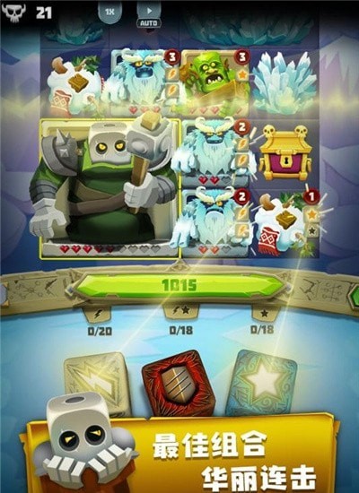 小伙伴们需要组建六枚骰子的战斗小队,每枚骰子刻有剑、盾、星星、闪电四种符号。剑符号发动攻击,盾符号生成护甲,星星和闪电则为技能充能。战斗时怪物会像消除游戏般从屏幕上方落下,击败最下方的敌人后上方敌人会眩晕坠落。每回合可以锁定两个骰子来凑组合,未使用的锁定机会能累积到下一轮。游戏包含主线关卡、特殊挑战和多人竞技模式,还能通过抽奖获取红龙、熊猫等稀有骰子,不同属性骰子搭配能触发元素加成哦。