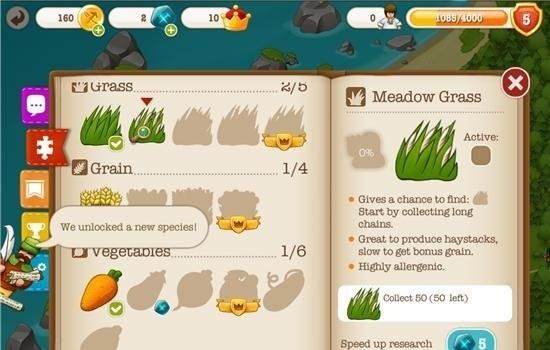 在村庄日记2中,你将经历发现新大陆、建造村庄、种植作物、采掘矿藏、探索海洋等一系列精彩冒险。游戏最大的特色是创新融合了连线消除玩法,资源获取主要就是通过消除小游戏完成的。只需要点击农场就能进入消除界面,将3个以上相同物资连成一条线就能获得资源。随着村庄发展,你还能解锁各种新道具、物种和材料,把移民区改造成繁荣的城镇。游戏中有11种卵生动物和11种牧场动物,它们不仅能带来食物和物资,还能为村庄增添活力呢!