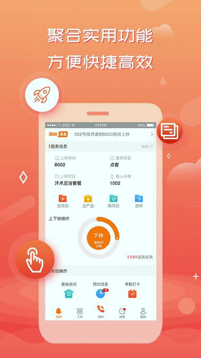 该产品功能体系围绕技师日常作业场景深度构建。核心模块包括实时任务管理系统,支持技师接收门店派发的服务订单,查看客户预约详情与历史记录;智能化排钟系统通过AI算法根据技师技能等级、地理位置、客户评价等维度自动分配任务;服务执行模块提供上下钟打卡、项目计时、加钟加项目等标准化操作流程;内部协同系统实现技师与前台、水吧等多部门实时联动。产品同时集成客户关系管理功能,支持服务过程中记录客户偏好、消费习惯等数据,并为技师提供移动端办卡、电子支付等增值服务工具。所有操作支持离线记录,待网络恢复后自动同步至云端,确保在弱网环境下仍可正常使用。