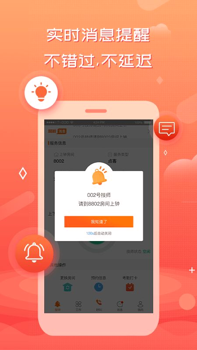 产品最突出的亮点在于智能化服务体验与全流程数据闭环。上钟倒计时功能会在服务接近结束时自动提醒,避免服务时长纠纷;智能匹配系统根据技师专业特长与客户需求实现最优派单,大幅减少人工调度时间;实时数据看板清晰展示个人业绩提成、钟数排名等关键指标,激励效果显著。安全监督机制对每次服务进行全程跟踪,采用高等级加密协议保护交易数据与客户隐私。多终端协同能力让手机端发起的操作实时同步至门店管理系统,形成从服务预约到售后反馈的完整数字化链路。