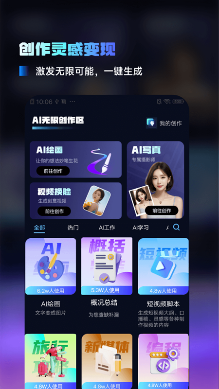 这个小帮手包含三大核心功能板块,首先是智能对话交互,集成了强大的中文训练模型,可以理解并回答各类复杂问题,从生活常识到专业知识都能应对自如。其次是创作功能,输入关键词就能自动生成结构完整的文章、诗词、学习计划等各类文本内容,还支持多种文体风格。最令人惊喜的是绘画生成能力,只需简单描述想象中的画面,选择喜欢的艺术风格,几秒钟内就能呈现独特的数字艺术作品。还提供语言翻译、代码生成、学习辅导等200多种实用工具,覆盖工作学习生活的方方面面。